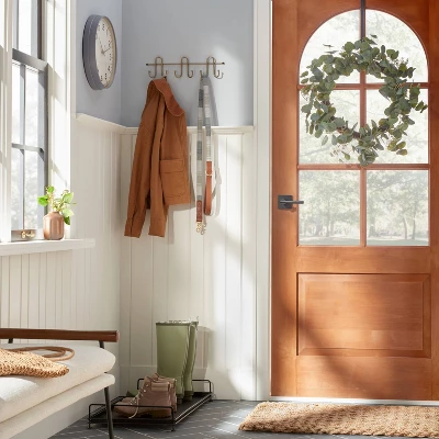 Add a stunning look to your indoor space with this Faux Seeded Eucalyptus Wreath from Hearth & Hand™ with Magnolia. Featuring faux eucalyptus leaves with white seeds that have realistic green coloring and detailing, this round wreath has a simple and clean design that pairs seamlessly with a variety of different decor styles. This faux wreath also has a lightweight design that makes it easy to hang and display for a crisp touch of greenery.