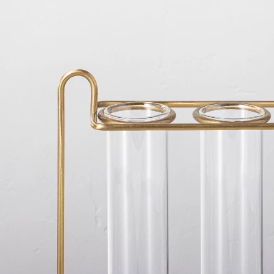 Add a simple yet striking centerpiece to your table display with the Propagation Vase Set from Hearth & Hand™ with Magnolia. This stylish vase set makes a welcoming tabletop accent. It features a stylish brass finish metal body with glass vases to display a few real or artificial blooms or dried stems. Set this vase set atop your fireplace mantel, entryway console, sideboard or shelf with other accent pieces to spruce up your decor.